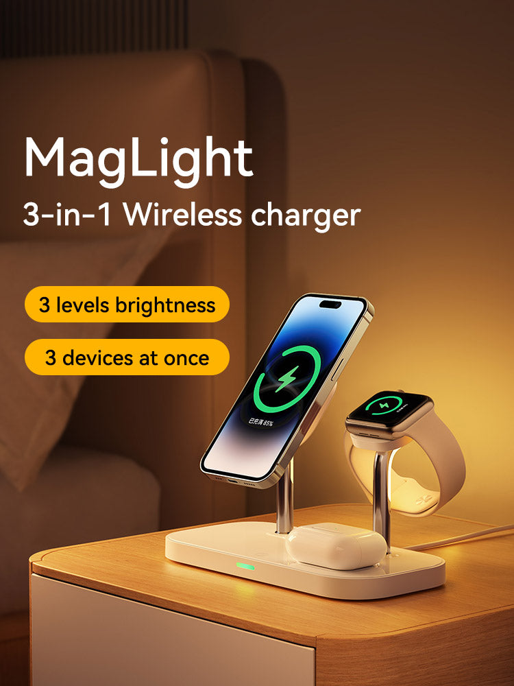 One is enough for your bedside. Maglight is a 3-in-1 wireless charger and a night light with 3 levels brightness. Charge all your devices (Phone, Airpods, iWatch) in one place, then turn off the light and go to sleep. Life should be this simple.